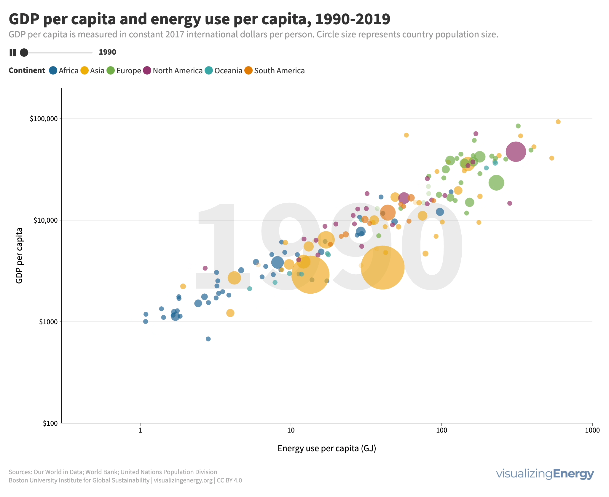The animation reveals an important phenomenon of the past half-century. Several large, low-income countries such as India and China experienced significant increases in affluence that were accompanied by increases in energy use per capita. Those countries move diagonally upwards in the visualization. On the other hand, high-income countries in Europe exhibit much slower rates of growth in affluence, which generally occur with little or no increase in energy use per capita.